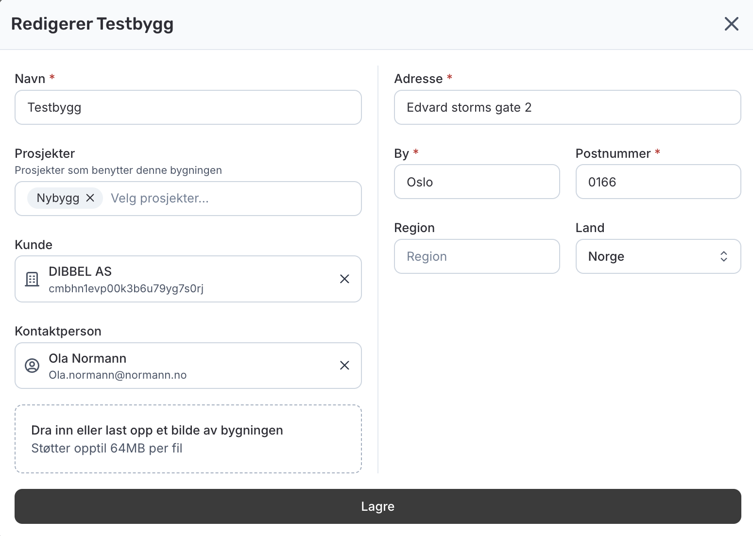 Lær hvordan du oppretter en bygning i Dibbel ved å fylle inn detaljer som kunde, prosjekt, kontaktperson og adresse.